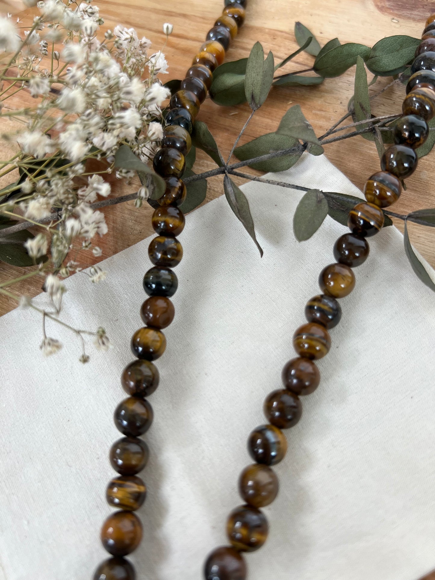 Die warm schimmernden Perlen tragen Sonnenkraft und Erdung zugleich. Tigerauge gilt traditionell als Stein der inneren Ausrichtung – schützend, stärkend, stabilisierend. Seine goldene Tiefe erinnert daran, dass Stärke nicht laut sein muss – sondern bewusst.