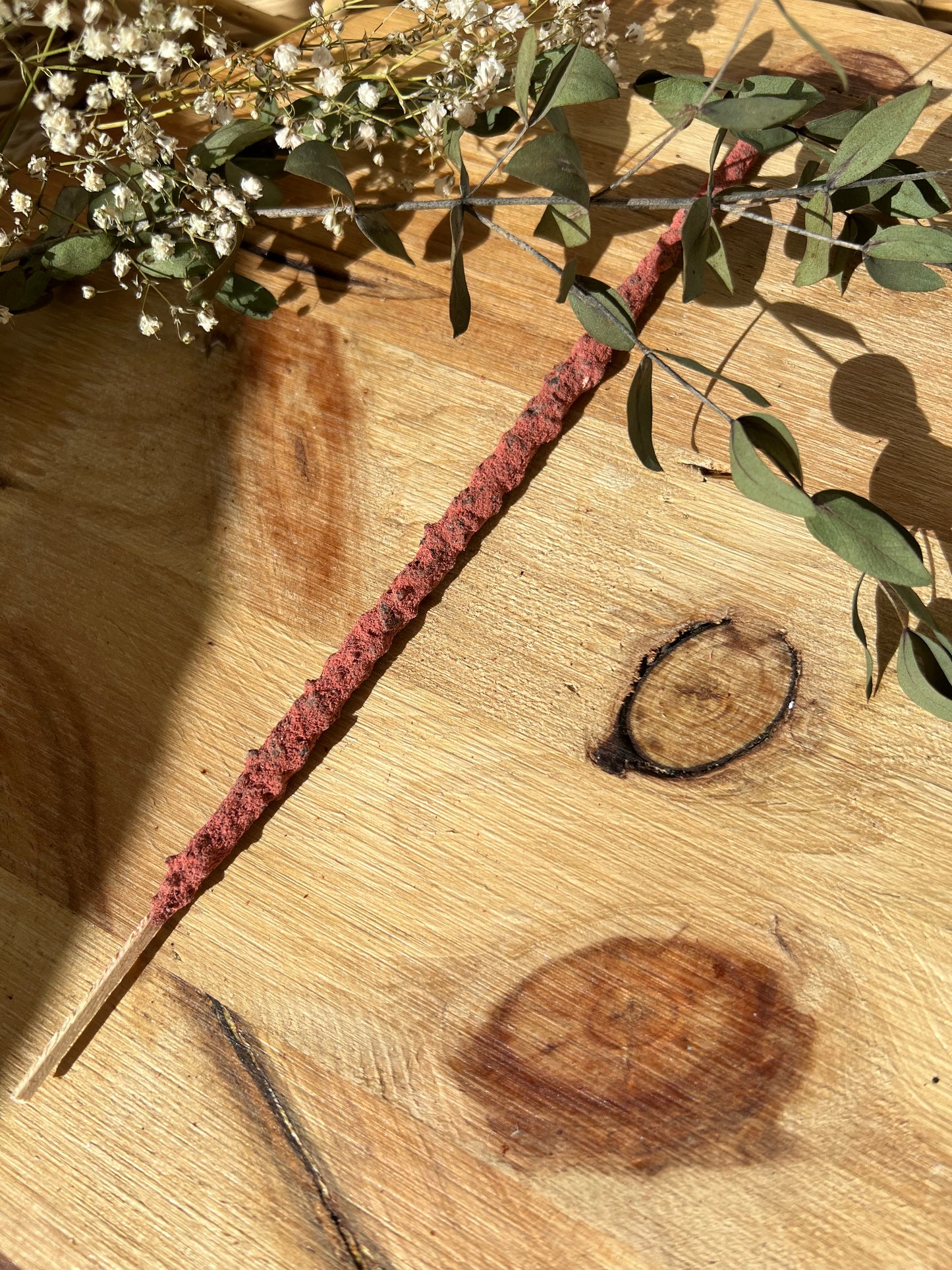 Ein Stäbchen brennt je nach Dicke und Länge etwa 30–60 Minuten. Du kannst es aber auch früher löschen, indem du die Glut an Sand oder einem feuerfesten Gefäß abstreifst.