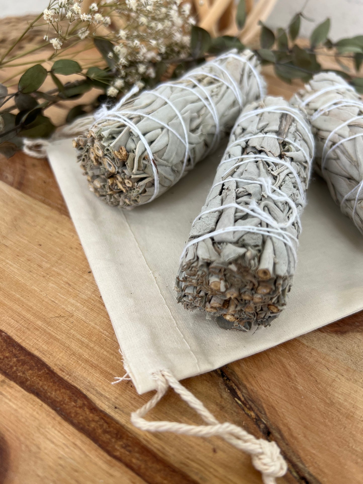 Unsere Bündel bestehen aus echtem weißen Salbei (Salvia apiana), traditionell wachsend in Kalifornien. Er wird schonend geerntet, luftgetrocknet und von Hand gebunden.